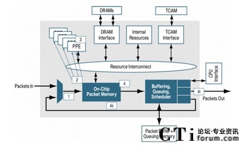 第一代QuantumFlow處理器(QFP)使用90nm工藝, QFP擁有40個定制QFP數(shù)據(jù)包處理引擎(PPE),每個PPE支持4個執(zhí)行線程。利用多達(dá)160個并行運(yùn)行的獨(dú)立處理器線程,平均每線程功耗僅0.51W, 遠(yuǎn)低于業(yè)界平均水平。同時QFP提供了一個高速的多核互聯(lián)總線,確保每個內(nèi)核都能及時快速的訪問到相關(guān)的資源,并且能夠避免在不夠先進(jìn)的硬件架構(gòu)中常見的CPU過度使用和超長延遲問題,而傳統(tǒng)的網(wǎng)絡(luò)處理器架構(gòu)僅有少量的內(nèi)核,因此需要使用交換矩陣或總線將多塊網(wǎng)絡(luò)處理器互聯(lián)才能達(dá)到和QFP相同的處理速度,其功耗遠(yuǎn)高于QFP系統(tǒng),而多塊網(wǎng)絡(luò)處理器資源互相訪問將會帶來大量的數(shù)據(jù)包延遲。
