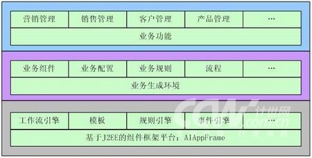 從總體上看AIOpenCRM定位為一個業(yè)務(wù)生成平臺,它分為三個部分,一個基于各種中間件(AIAppFrame、WorkFolw、BusinessRule等)實現(xiàn)的業(yè)務(wù)生成環(huán)境,第二個是基于業(yè)務(wù)邏輯數(shù)據(jù)模型實現(xiàn)的業(yè)務(wù)對象,最后是基于業(yè)務(wù)生成環(huán)境以及業(yè)務(wù)對象實現(xiàn)的業(yè)務(wù)功能。它們都是基于J2EE技術(shù)進(jìn)行實現(xiàn)的。如下圖所示: