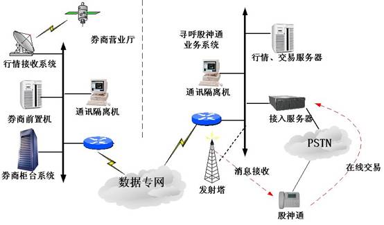最終我們的設(shè)想是類(lèi)似于呼叫中心的外包方式,由尋呼臺(tái)建立一套短訊接入系統(tǒng),并與券商的交易系統(tǒng)聯(lián)網(wǎng)(通過(guò)交易前置機(jī)),各券商租用部分資源,同時(shí)給他們的股民提供股神通話機(jī),股民們一方面可通過(guò)尋呼臺(tái)的無(wú)線資源接收股市信息,另一方面可以通過(guò)電話線接入尋呼的交易系統(tǒng)進(jìn)行交易。
