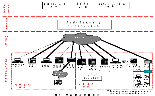 用戶接入層―――通過媒體網(wǎng)關(guān)將PSTN網(wǎng)絡(luò)或移動GSM或CDMA網(wǎng)絡(luò)的客戶服務(wù)請求通過H323協(xié)議和RTP協(xié)議統(tǒng)一接入到IP網(wǎng)絡(luò)中來;用戶也可以通過IP話機器或多媒體軟話機直接接入到呼叫中心系統(tǒng)中來;部分客戶還可以通過文本聊天工具接入到呼叫中心.