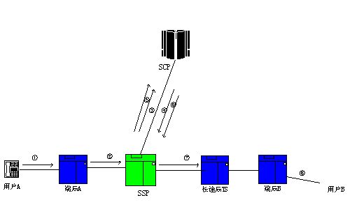 、 發(fā)起端局接受呼叫并根據(jù)用戶A撥打的接入碼(如962855)將呼叫選路至業(yè)務(wù)交換點(diǎn)SSP;