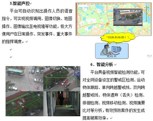 由于海量視頻信息的出現(xiàn),要求平臺能利用智能視頻技術(shù)來解決傳統(tǒng)視頻監(jiān)控系統(tǒng)所無法解決的問題。如智能檢索、人臉識別、車牌識別、運動軌跡跟蹤、行為模式分析等,變“被動監(jiān)控”為“主動監(jiān)控”,以提升視頻監(jiān)控系統(tǒng)的應用成效,降低管理成本。