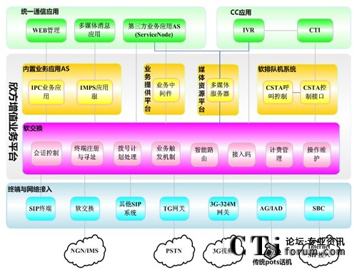 可在此基礎上提供形成了多媒體呼叫中心、IPPBX、IPCentreX、IVR/IVVR二次開發(fā)平臺、一號通、即時消息/呈現等一系列的重量級新型業(yè)務,同時其所提供的業(yè)務開發(fā)能力允許第三方自主的研發(fā)和部署的業(yè)務應用,滿足業(yè)務應用的個性化需求。