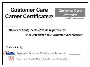 學(xué)員在經(jīng)過完整的課程培訓(xùn)之后,經(jīng)考試合格,可以獲得由美國俄亥俄州立大學(xué)與太維資訊有限公司聯(lián)合頒發(fā)的的專業(yè)培訓(xùn)證書。客戶服務(wù)中心認(rèn)證的目的有兩個(gè):首先,對(duì)于已經(jīng)在客服中心從業(yè)的人員,太維公司的培訓(xùn)可以提供一個(gè)提升他們工作能力的機(jī)會(huì),通過培訓(xùn)后不同層次的專業(yè)培訓(xùn)認(rèn)證,太維公司以行業(yè)的標(biāo)準(zhǔn)要求對(duì)他們的提升加以證明,以加強(qiáng)他們?cè)谛袠I(yè)中的競(jìng)爭(zhēng)能力。其次,對(duì)于有志致力于在客戶服務(wù)行業(yè)從業(yè)的人事,太維公司廣泛深入、滿足各種需求的專門技術(shù)培訓(xùn)與相應(yīng)的不同層次的認(rèn)證,為他們進(jìn)入該行業(yè)提供一個(gè)標(biāo)準(zhǔn)的素質(zhì)證明,以使他們能夠順利勝任客戶服務(wù)中心的各種主要的工作職位。