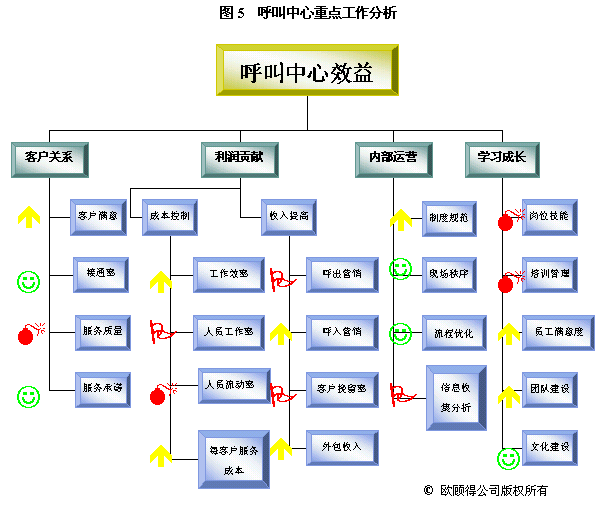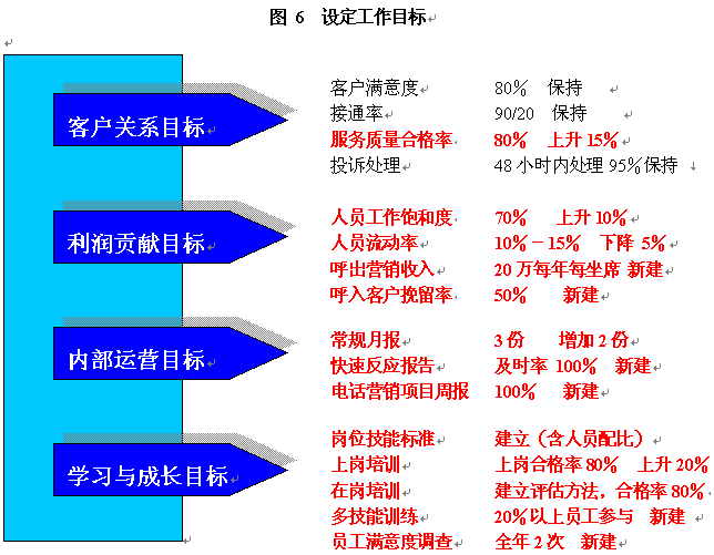 根據(jù)年度重點工作及目標,我們就可以設計關鍵措施來使其實現(xiàn)。通常一項關鍵措施可以有助于幾個目標的達成。如建立培訓體系,可以使得在崗培訓、上崗培訓、多技能訓練以及崗位技能達標率有所提升,而體現(xiàn)在業(yè)務上的效果則是服務質(zhì)量的提升、呼出營銷收入增加和客戶挽留率提高。