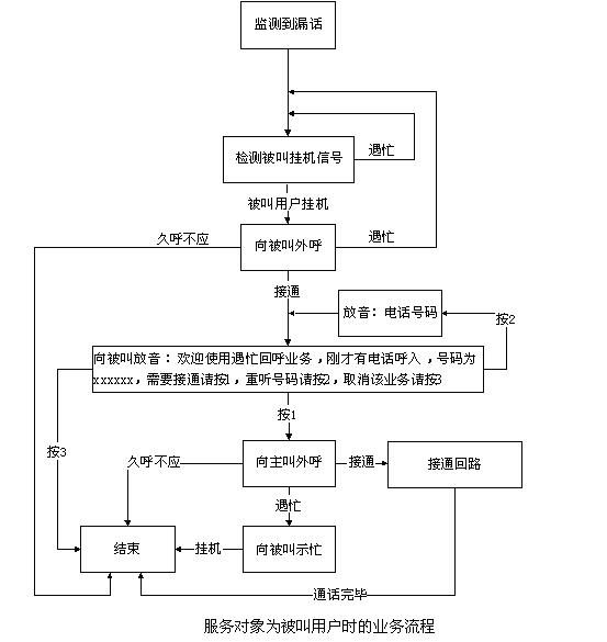 當(dāng)服務(wù)對象是被叫用戶時,產(chǎn)生遇忙漏話后,東進漏話監(jiān)測設(shè)備(DMCS)實時檢測被叫用戶的掛機信號,如果被叫掛機,則先向被叫外呼,呼出接通后,語音提示“歡迎使用遇忙回呼業(yè)務(wù),剛才有電話呼入,號碼為xxxxxx,需要接通請按1,重聽號碼請按2,取消該業(yè)務(wù)請按3”,如按1,系統(tǒng)向原主叫外呼(亦稱回呼),回呼成功(ACM)后,建立話音回路,進一步接續(xù);如回呼原主叫時遇忙(SLB、STB等),則回呼失敗,向被叫用戶示忙。