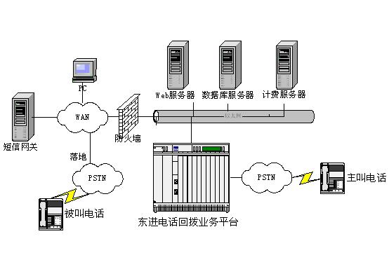 東進回撥業(yè)務平臺利用主叫收費和被叫收費的差異,通過軟交換技術的靈活性和開放性,實現(xiàn)呼叫流程上的變化,用網絡傳遞語音數據包,再將信號接入一些租用的公共電信網絡實現(xiàn)通話功能,運營商或者虛擬運營商通過收取資費,從而打到用戶節(jié)省通話資費的目的。系統(tǒng)的拓撲圖如下所示。