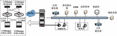 系統(tǒng)整體采用集中式架構(gòu),呼叫中心平臺采用東進(jìn)公司基于Yessoe技術(shù)開發(fā)的Seegoe多媒體交換機和Seegoe通信服務(wù)器。呼叫中心平臺與物流公司內(nèi)部的物流管理系統(tǒng)(如LM、SCM)通過TCP/IP進(jìn)行結(jié)合。呼叫中心系統(tǒng)具有豐富的媒體資源和強大的處理能力,并提供功能模塊的N+1全冗余備份,滿足了高負(fù)荷、大并發(fā)和關(guān)鍵業(yè)務(wù)的可靠運營。其次,Seegoe呼叫中心平臺在媒體交換層以全新的IP架構(gòu)實現(xiàn)網(wǎng)絡(luò)融合、應(yīng)用融合和業(yè)務(wù)融合,能夠很好的滿足電視購物行業(yè)對呼叫中心的要求。