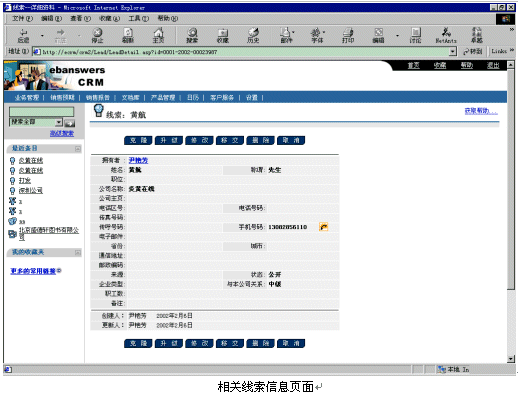 Ebanswers CRM系統(tǒng)去激活相關(guān)客戶資料的IE頁面進(jìn)行處理:如果此號(hào)碼數(shù)據(jù)庫中存在,則顯示此人的信息,如果不存在,則顯示CRM中添加新線索的頁面。而Ebanswers