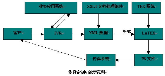 用戶(hù)通過(guò)IVR與業(yè)務(wù)應(yīng)用系統(tǒng)交互,獲得所需的傳真數(shù)據(jù),這些傳真數(shù)據(jù)在系統(tǒng)中以XML數(shù)據(jù)的格式存在,系統(tǒng)然后調(diào)用XSLT(英文縮寫(xiě),XSLT是語(yǔ)言,專(zhuān)門(mén)處理XML數(shù)據(jù),通過(guò)一段XSLT程序可以將XML數(shù)據(jù)轉(zhuǎn)換成其他的形式的文檔,如HTML,LATEX文檔,從而用來(lái)顯示XML數(shù)據(jù)給人們閱讀)文檔處理組件對(duì)XML數(shù)據(jù)處理,處理結(jié)果是LATEX(LATEX是TEX系統(tǒng)增加了一些宏指令的增強(qiáng),TEX系統(tǒng)是一個(gè)計(jì)算機(jī)排版系統(tǒng),