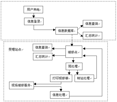 維修點對用戶的報修情況進行預處理之后,根據(jù)用戶所在的區(qū)域,分配至最近距離的維修站,將用戶與其報修信息即時轉(zhuǎn)移,這也就是圖中所顯示的"轉(zhuǎn)站處理"。之后,維修站將直接打印出報修單,加快服務(wù)實施的效率、減少人工出錯的比例,有專業(yè)人員及時上門服務(wù)檢修。