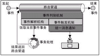 在路由管道中流轉(zhuǎn)著加載了業(yè)務的工作流事件。事件按照事先定義的路由規(guī)則流轉(zhuǎn),事件的路由規(guī)則定義了事件在路由管道中可以?康摹罢九_”,同時定義了事件到達“站臺”時可以領取并處理加載在事件上的業(yè)務的角色。事件從始發(fā)站臺進入路由管道,經(jīng)過一個或多個中間站臺,最后到達終點站。事件每?恳粋站臺,相關(guān)人員領取事務,并進行處理后重新裝載事務,觸發(fā)事件向下一個站臺流轉(zhuǎn),除非事件已經(jīng)到達終點站。