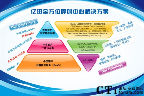 Service Software”;而“易之愛(ài)彼喜喜”及“易之風(fēng)”產(chǎn)品,顧名思義,就是億迅推出基于CESS理念的呼叫中心產(chǎn)品EZIPCC及EZPhone的中文注釋,因?yàn)楹?jiǎn)單容易,讓客戶更喜歡;“CHANGE”不僅代表了億迅發(fā)展的這11年一直秉持創(chuàng)新與改革的經(jīng)驗(yàn)哲學(xué),也代表了億迅自主研發(fā)的核心CRM產(chǎn)品“EZactor”在高端市場(chǎng)與主流戰(zhàn)略合作伙伴的關(guān)系,其中的“C”,是指CISCO;“H”指Huawei;“A”指“AVAYA”;“N”指Nuance;“G”指Genesys;而最后的“E”,則代表了eSOON。