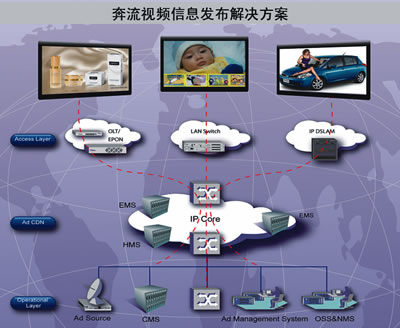 UT斯達(dá)康緊跟市場(chǎng)發(fā)展趨勢(shì)和運(yùn)營(yíng)商步伐,深入研究戶(hù)外液晶廣告業(yè)務(wù)的發(fā)展、大力推進(jìn)廣告平臺(tái)的研發(fā)。2006年,UT斯達(dá)康推出了奔流(RollingStream)視頻信息發(fā)布解決方案(如圖2所示)。奔流視頻信息發(fā)布解決方案是以奔流(RollingStream)IPTV平臺(tái)為基礎(chǔ),結(jié)合戶(hù)外液晶廣告市場(chǎng)需求,融合運(yùn)營(yíng)商以視頻為主的綜合信息發(fā)布的需求,真正運(yùn)營(yíng)級(jí)的電信級(jí)解決方案。該方案可以幫助運(yùn)營(yíng)商實(shí)現(xiàn)融合信息服務(wù)和廣告業(yè)務(wù)的統(tǒng)一運(yùn)營(yíng),幫助運(yùn)營(yíng)商開(kāi)展兼具公益性和盈利性的信息發(fā)布業(yè)務(wù),運(yùn)營(yíng)商在推進(jìn)社會(huì)信息化、造福公眾的同時(shí),通過(guò)視頻廣告的運(yùn)營(yíng),也能獲取盈利。該方案基于電信級(jí)平臺(tái)的穩(wěn)定性、安全性、擴(kuò)展性設(shè)計(jì)要求,可支持百萬(wàn)級(jí)大規(guī)模部署能力,可提供電信級(jí)質(zhì)量保證的服務(wù);該方案基于IP流媒體技術(shù),可通過(guò)IP網(wǎng)絡(luò)實(shí)時(shí)、精準(zhǔn)、互動(dòng)地投放廣告內(nèi)容,從而可以支持豐富、新穎的廣告運(yùn)營(yíng)模式;該方案基于數(shù)字多媒體技術(shù),除了可以發(fā)布視頻廣告,還可以發(fā)布圖片、文字、消息等廣告內(nèi)容。