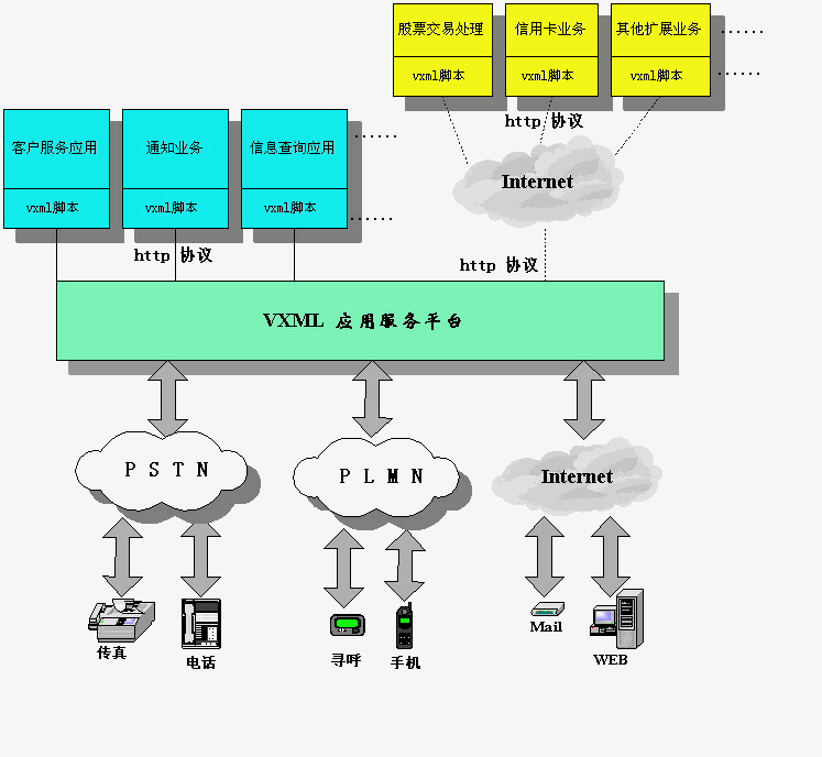 2000年3月由AT&T,Lucent,Motorola,IBM四家公司發(fā)起并提出的VoiceXML標準語言為語音增值業(yè)務(wù)的發(fā)展帶來了新的生機和變化。由于VoiceXML是XML語言的分支和子集,因此天然可以與因特網(wǎng)無縫連接。這使得傳統(tǒng)的語音業(yè)務(wù)可以無限擴展到龐大的互聯(lián)網(wǎng)體系中,可以真正“讓我們用聲音傾聽互聯(lián)網(wǎng)”。