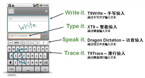 T9 Trace是Nuance T9產(chǎn)品組合中的一員,與T9、XT9、T9 Write等輸入技術(shù)共同為用戶打造多模式輸入體驗,使用戶擁有更多選擇,可以按照個人喜好輕松組合更快捷的輸入方法。T9 Trace憑借Nuance強大的語言數(shù)據(jù)庫,能夠支持多達70多種語言,是目前市面中支持語言最多的輸入技術(shù)。同時,T9 Trace也是國內(nèi)首推的支持中文拼音(全拼輸入)的滑行輸入法。