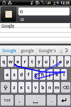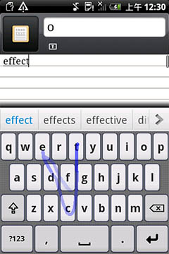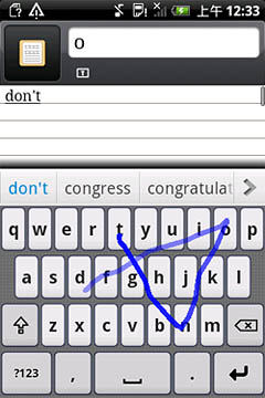 如圖所示,Nuance T9 Trace英文輸入方案對于各種不同的字母組合都能有效識別,像“google”這種既有連續(xù)又有間斷重復字母的單詞也不在話下,一次就能精準輸出。另外,該輸入法還可以省去標點符號,如“don"t”“can"t”等單詞,用戶只需滑觸“d-o-n-t”這四個字母,輸入法就會自動識別。