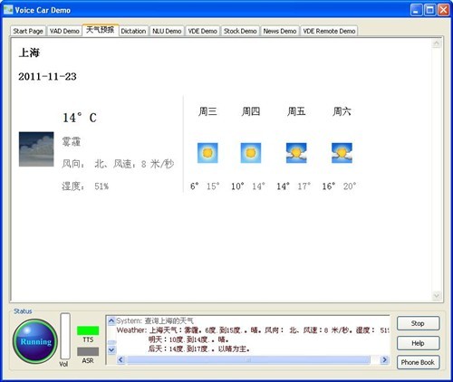 比方說這個關(guān)于空調(diào)問題,我們過去,空調(diào)的命令詞是“把空調(diào)打開,空調(diào)溫度提高3度。”現(xiàn)在我也可以這樣說,空調(diào)調(diào)高一點(diǎn),我有點(diǎn)冷,也可以。就是你在車?yán)镞呁耆梢杂媚阕约旱恼Z言來說你想干的事。比如說,前邊你不知道明天天氣會怎么樣,人一般都會想想,明天天氣如何,或者是告訴我天氣預(yù)報。但是你也可以這樣說。明天會下雨嗎?也可以這樣說;蛘吣氵@樣說,你說,今天大盤怎么樣。完全是用自然語言來說。堵不堵車,“查詢交通情況。”這就是,實(shí)際上可以有各種不同的說法來完成這個任務(wù),這是我們自然語言的一個演示。
