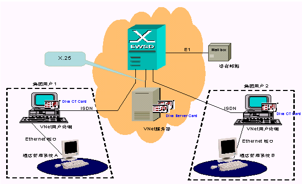 EWSD交換機提供的增強型CENTREX(虛擬集中用戶交換業(yè)務(wù))業(yè)務(wù)平臺VNet,能夠使運營商在PSTN公網(wǎng)中向大客戶和重要客戶提供性能與用戶交換機PBX相似的集團用戶解決方案.由于VNet功能基于EWSD交換機, 因此能提供給用戶最大的可靠性.利用VNet豐富的性能和EWSD靈活的組網(wǎng)方案,在保證VNet的CERNTREX用戶享有PSTN公網(wǎng)的所有性能的同時,可以根據(jù)用戶的特定需求提供有針對性的解決方案,完全滿足集團用戶,商業(yè)用戶的通信需要. 此系統(tǒng)應(yīng)用了Eicon公司性能卓越的Diva ISDN Server系列產(chǎn)品。網(wǎng)絡(luò)應(yīng)用如圖所示: