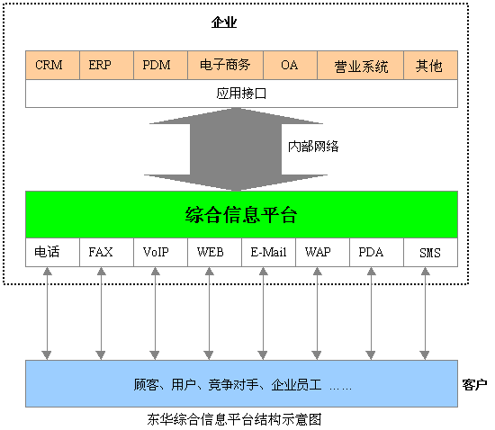 東華集團(tuán)綜合信息平臺(tái)系統(tǒng)可集中企業(yè)客戶服務(wù)的優(yōu)勢(shì)資源,采用人工業(yè)務(wù)代表服務(wù)與自動(dòng)語音服務(wù)相結(jié)合的形式,通過電話、Email、Web、尋呼、IP電話/傳真、視頻、段消息等接入方式和服務(wù)手段,向客戶提供業(yè)務(wù)受理、信息查詢、商品定購(gòu)服務(wù),以及接受客戶的咨詢、建議及投訴,也可以通過主動(dòng)撥出做社會(huì)調(diào)查、市場(chǎng)調(diào)查、商品直銷及資費(fèi)欠費(fèi)催繳等。