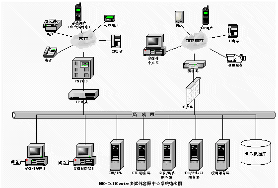 普通電話用戶通過PSTN接入DHC- UIPS綜合信息平臺(tái)系統(tǒng),接受話務(wù)員服務(wù)或自動(dòng)業(yè)務(wù)流程。傳真用戶進(jìn)入系統(tǒng)可以進(jìn)行傳真業(yè)務(wù)。計(jì)算機(jī)用戶也可以通過Internet訪問企業(yè)客戶服務(wù)系統(tǒng)主頁(yè),獲得服務(wù)。同時(shí)計(jì)算機(jī)用戶也可以通過Internet利用網(wǎng)絡(luò)電話的功能要求話務(wù)員服務(wù)或自動(dòng)業(yè)務(wù)流程。