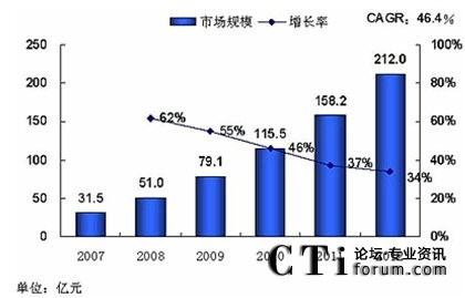 再來看看統(tǒng)一市場的前景,下圖是某咨詢公司對國內(nèi)統(tǒng)一通信市場的預(yù)測數(shù)據(jù),2012年將達到212億元,盡管可能存在一定水份,但這么多公司介入這個市場,本身就體現(xiàn)了發(fā)展?jié)摿,這點不容懷疑。