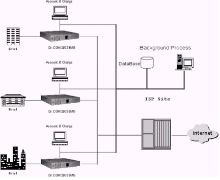 這是一個(gè)全面的方案。一方面通過五類雙絞線(即以太網(wǎng),也可通過機(jī)頂盒或ADSL)將整個(gè)酒店的客房、網(wǎng)吧甚至酒店內(nèi)部網(wǎng)絡(luò)系統(tǒng)以一定的安全手段(如VLAN)聯(lián)成一個(gè)局域網(wǎng),另一方面用路由器通過DDN、ADSL等高速線路連接到Internet,兩者之間就是Dr.COM