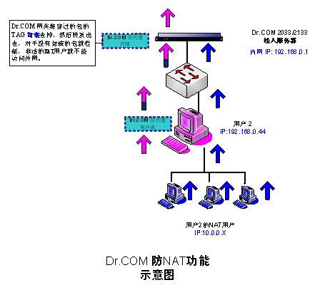 共享合法用戶的身份的NAT用戶,由于他們發(fā)出的數(shù)據(jù)包是沒有經(jīng)過封裝的,雖然經(jīng)過合法用戶的電腦實現(xiàn)了地址轉(zhuǎn)換,但Dr.COM的防代理客戶端不會對這些NAT用戶的數(shù)據(jù)包進(jìn)行封裝,所以這些數(shù)據(jù)包就在網(wǎng)關(guān)被過濾掉,代理用戶就不能正常上網(wǎng)。