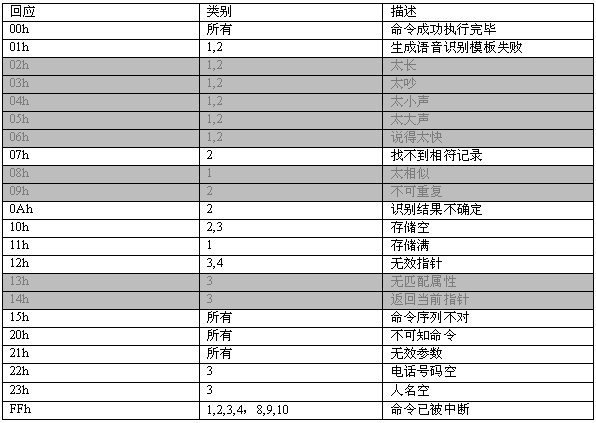 命令描述: 訓(xùn)練一個名字。當(dāng)增加一條電話本記錄時,應(yīng)先執(zhí)行此命令。該命令會生成一個語音模板,同時產(chǎn)生一個長達(dá)2秒的名字錄音。在此命令成功執(zhí)行之后,MCPU接著發(fā)送06h命令增加電話號碼。如果沒有執(zhí)行06h命令,則該項(xiàng)記錄電話號碼為空。
