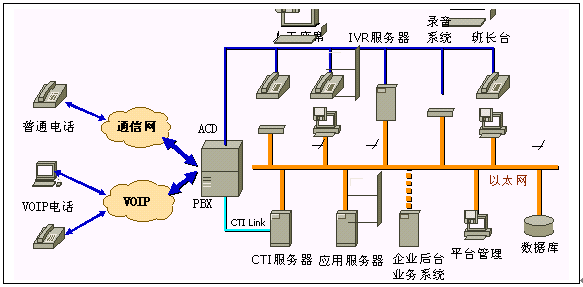 ·CTI服務(wù)器:將電話交換系統(tǒng)和計(jì)算機(jī)系統(tǒng)有機(jī)地結(jié)合起來(lái)