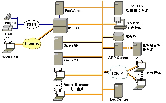 根據(jù)上述幾點,上海聲軟網(wǎng)絡(luò)技術(shù)有限公司(www.voicesoft.cn)的CommSuites for IPCC系統(tǒng)就是就是專門為中小企業(yè)量身定制的的IP呼叫平臺,CommSuites采用3COM的IP交換機NBX交換機為通信接入子系統(tǒng),結(jié)合CommSuites的CTI中間件,組成功能完善的IP呼叫中心平臺,下面是CommSuites for IPCC系統(tǒng)結(jié)構(gòu)圖: