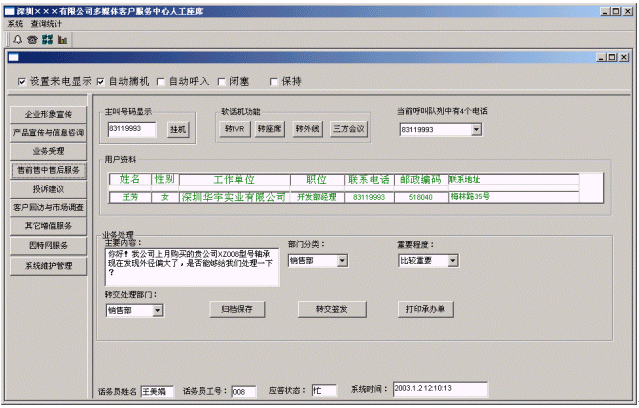 A 售前服務:由于系統(tǒng)以事先存入企業(yè)產品的宣傳資料,即使在無人值守的情況下,客戶亦通通過電話,傳真等方式獲取所需產品的詳細資料,實現(xiàn)全線產品的售前咨詢