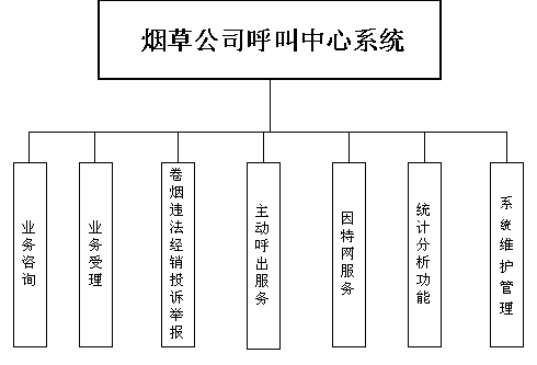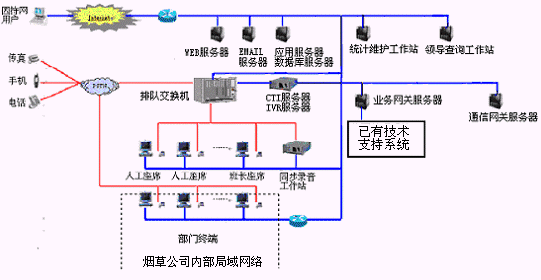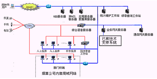卷煙經(jīng)銷戶等客戶利用電話、傳真、電子郵件、因特網(wǎng)、手機、短消息等撥打統(tǒng)一的特服號碼(如800XXX或9XXXX)進入煙草公司呼叫中心,本系統(tǒng)依托煙草公司各類業(yè)務(wù)技術(shù)支持系統(tǒng)和網(wǎng)絡(luò)系統(tǒng),實現(xiàn)煙草專賣局原有管理系統(tǒng)/業(yè)務(wù)系統(tǒng)及數(shù)據(jù)庫的無縫連接,通過人工受理或自動語音服務(wù)等方式全天24小時不間斷地為客戶提供各種服務(wù)。