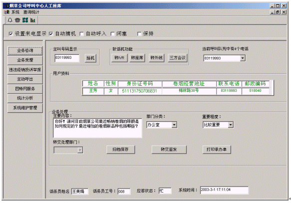 煙草公司呼叫中心將接入功能、導航功能、自動語音查詢功能、人工座席服務(wù)功能、話路轉(zhuǎn)接功能、信息資料處理緊密聯(lián)系起來。用戶撥打特服電話號碼后,可以根據(jù)需要選擇人工服務(wù)、自動語音查詢、自動留言,并能夠在幾種服務(wù)中來回切換或轉(zhuǎn)接其它電話;所記錄的資料可以分門別類的進行統(tǒng)計并形成報表,供相關(guān)部門進行檢索查閱;意見處理完畢,可由座席主動呼叫用戶,告知處理意見,形成閉環(huán)處理流程。