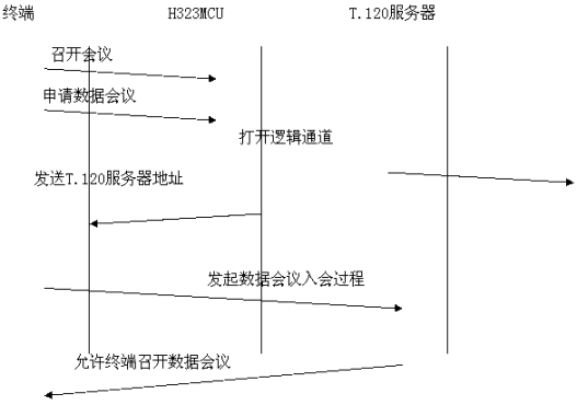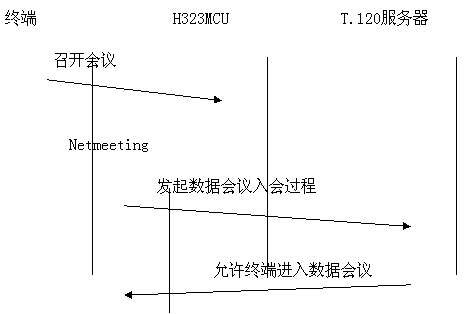 采用帶外方式,數(shù)據(jù)與音頻視頻流分開,各自占用帶寬。與終端和MCU無任何關(guān)系。如果用戶想召開數(shù)據(jù)會(huì)議,需要單獨(dú)的一臺PC機(jī)來進(jìn)行數(shù)據(jù)的接受與傳送,所有需要數(shù)據(jù)會(huì)議功能的用戶的PC機(jī)都連接到一個(gè)T.120服務(wù)器上。目前常用的終端軟件是Netmeeting軟件。數(shù)據(jù)占用單獨(dú)的帶寬,不擠占音視頻的帶寬。會(huì)議建立過程為: