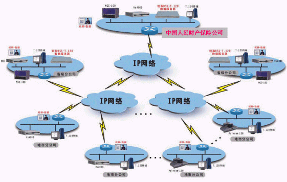 中國人民財產(chǎn)保險股份有限公司,是中國內(nèi)地最大的非壽險公司,香港證交所上市公司。經(jīng)過50多年的發(fā)展,中國人保財險公司已經(jīng)發(fā)展成為網(wǎng)點(diǎn)遍布全國31個省市區(qū),共有營業(yè)機(jī)構(gòu)4000余個的大型商業(yè)公司。為提高辦公效率,降低差旅成本,中國人保財險公司決定建設(shè)覆蓋從總公司、省分公司到地市分公司的視頻會議系統(tǒng),項(xiàng)目總?cè)萘窟_(dá)600多個節(jié)點(diǎn),采用兩級級連方式組網(wǎng),要求系統(tǒng)具備視頻、音頻、數(shù)據(jù)交互功能,。