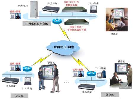 如上圖所示,廣州供電局視頻會議系統(tǒng)基于IP/E1雙網(wǎng)絡,MCU采用華為Viewpoint8620綜合視訊交換平臺,終端采用華為ViewPoint