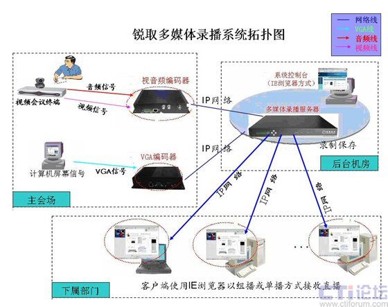 如上圖所示,硬件系統(tǒng)采用了前后臺分離的模式,前端的視音頻編碼器將從終端上采集的視音頻信號與VGA編碼器采集的VGA信號進(jìn)行編碼,通過內(nèi)部專屬網(wǎng)絡(luò)傳輸?shù)胶笈_機(jī)房的錄播服務(wù)器中,通過服務(wù)器內(nèi)部功能模塊,不僅將整個會議或者培訓(xùn)現(xiàn)場的視音頻與電腦桌面內(nèi)容同步錄制保存在專屬硬盤中,同時將上述采集內(nèi)容實(shí)時轉(zhuǎn)發(fā)直播到用戶局域網(wǎng)中。通過錄播系統(tǒng)的身份驗(yàn)證機(jī)制,通過連接到網(wǎng)絡(luò)中的任意一臺PC即可接收直播的內(nèi)容。同時錄制保存在專屬硬盤上的內(nèi)容還可以后期點(diǎn)播回訪(需身份驗(yàn)證)。