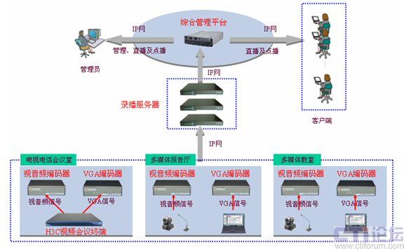 對(duì)于學(xué)校經(jīng)常進(jìn)行學(xué)術(shù)報(bào)告的錄播,可以將多媒體報(bào)告廳的視頻和音頻輸入到視音頻編碼器上,將電腦的VGA輸入到VGA編碼器上,視音頻編碼器和VGA編碼器可以將接入的信號(hào)進(jìn)行編碼,通過網(wǎng)絡(luò)傳給錄播服務(wù)器進(jìn)行信號(hào)處理、整合,最終傳輸?shù)骄C合管理平臺(tái)上。