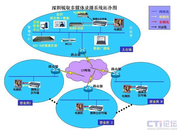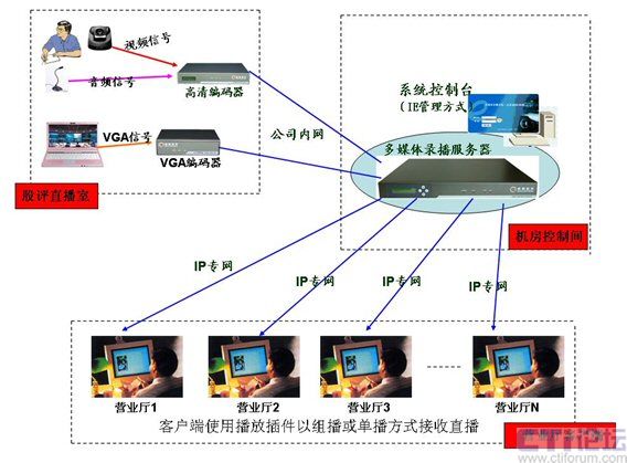 如上圖所示,在多媒體股評(píng)直播室中,股評(píng)師的講解圖像和聲音以及電腦中分析數(shù)據(jù)同步傳輸采集到控制機(jī)房中,通過多媒體錄播服務(wù)器直播模塊的組播方式將信息傳達(dá)給全國(guó)遍布的營(yíng)業(yè)網(wǎng)點(diǎn),實(shí)現(xiàn)股評(píng)直播的需求。(權(quán)威股評(píng)師將在每天下午股市休市后對(duì)一天當(dāng)中股票大盤做一次全面的分析,并對(duì)本周或某行業(yè)的形式做一個(gè)全面的總結(jié),并對(duì)未來形勢(shì)做出判斷。)