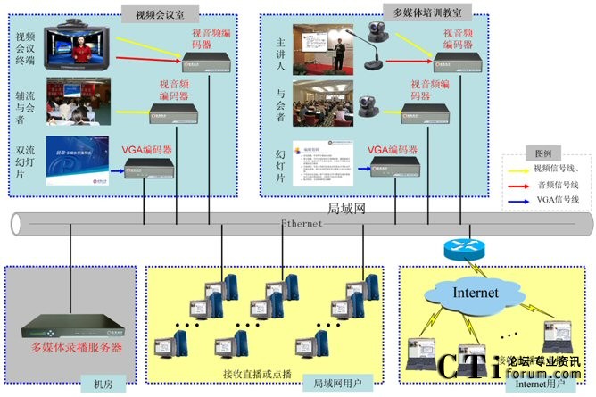 銳取多媒體錄播系統(tǒng)采用了分布式的架構,前端的視音頻編碼器負責視音頻信號的采集,后臺的多媒體錄播服務器負責信號的錄制、直播和點播。多媒體錄播系統(tǒng)可從視頻會議終端上獲取信號,并將視頻會議實時直播到沒有視頻會議終端覆蓋的分行,擴大了視頻會議的參與范圍,讓更多的員工可以參加遠程培訓。