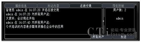 系統(tǒng)增加了多方文字互動交流功能,在線交流功能可以選擇給所有人員發(fā)送消息,也可以選擇給某一特定人員發(fā)送。這樣在會議或培訓的過程中,管理員可以選擇性的提出相應的問題給相關人員,考核相關人員的培訓效果;其他人員也可以將會議或培訓過程中遇到的疑問、難點及時的反應給管理員進行解答,增強會議或培訓的成效。