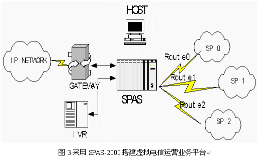 中國加入WTO后,國內(nèi)與國際的聯(lián)系、交流和溝通將會越來越頻繁,這一趨勢帶來了巨大的電信服務市場商機。同時,國際電信企業(yè)正在尋求進入中國的途徑,國內(nèi)新興的電信運營商積極應對這種局面,而虛擬電信運營商也在國內(nèi)開始出現(xiàn)。如何爭取客戶是所有這些提供電信服務的企業(yè)共同面臨的課題。一個智能化的、高效的、靈活的、有特點并易于控制的服務平臺無疑是他們進行競爭的重要工具。由于SPAS-2000可編程交換機是一個全開放的靈活平臺,用戶通過應用程序幾乎可以完全控制交換,能很好的滿足用戶的需求。在此SPAS-2000可編程交換機上開發(fā)的電話批發(fā)及零售業(yè)務應用,配合計算機技術,能靈活控制業(yè)務的路由選擇、費率計算并可提供個性化服務,為運營商降低運營成本,提高服務質(zhì)量給出了有效的解決方案。例如一個IP電話運營商在全球互連中可能有多個合作伙伴,每個合作伙伴提供的服務也不相同,為了節(jié)省費用并提高服務質(zhì)量,IP電話運營商需要根據(jù)時段、費率、通話質(zhì)量、接通率等指標智能選擇去話路徑。SPAS-2000可編程交換機提供編程開發(fā)接口,通過E1與IVR連接,在服務器上開發(fā)高層應用軟件,可以實現(xiàn)多種高級功能。同時SPAS還可以連接各種型號的網(wǎng)關。應用連接圖見圖3: