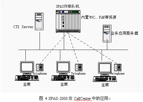 目前國內(nèi)呼叫中心的建設方興未艾,企業(yè)為了改善服務,贏得客戶,紛紛建設自身的呼叫中心。如果建立呼叫中心全部采用國外設備,價格非常昂貴,使很多客戶望而卻步。這樣大的投資目前也只有電信(包括移動和聯(lián)通)、電力、銀行等資金充裕的行業(yè)才能承受。而且,根據(jù)我方了解,即使這些行業(yè)也在控制采購成本,原先只注重名牌,不計成本的情況正在改變。而在目前宏觀經(jīng)濟形勢不景氣的大背景下,大中型企業(yè)既要加快企業(yè)信息化建設,保住客戶,降低成本,又要精打細算,規(guī)避投資風險。我們掌握建立呼叫中心設備的所有核心技術,因此在呼叫中心應用方面有很大的價格優(yōu)勢,這樣就降低了擁有呼叫中心的門檻,在這個市場上也有很強的競爭力。采用SPAS-2000可編程交換機支持智能業(yè)務通用編程接口,可以作為CallCenter核心設備,應用圖見圖4: