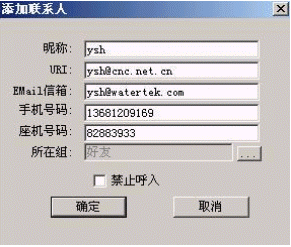 可以在這里進(jìn)行所給的各項(xiàng)操作,選擇添加聯(lián)系人,輸入某個(gè)用戶的各項(xiàng)個(gè)人信息,確認(rèn)后,這個(gè)用戶就會(huì)被添加到相應(yīng)的組中,并且會(huì)顯示出該用戶狀態(tài)。
