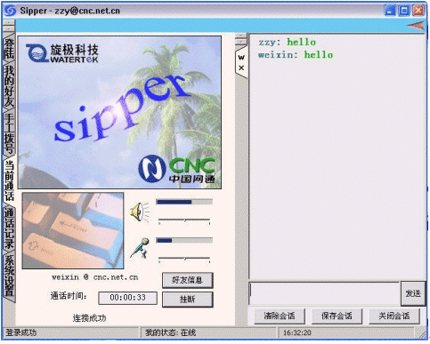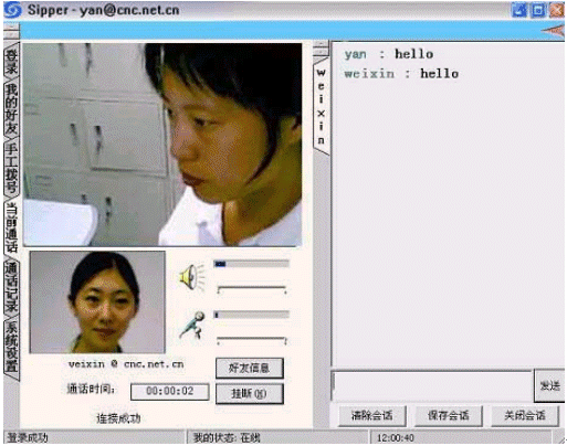 點(diǎn)擊后會(huì)出現(xiàn)對話窗口,同時(shí)在對方的機(jī)器上會(huì)出現(xiàn)你的呼叫請求,如果對方"接收"了你的請求,則兩個(gè)人的語音對話開始,雙方可以互相聽到聲音,沒有圖象,可以同時(shí)進(jìn)行短信交流。