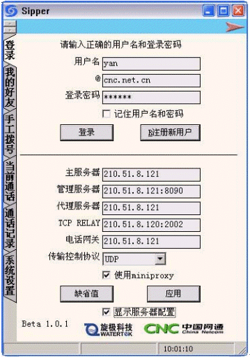 在主界面上選擇"注冊新用戶",這時(shí)會(huì)出現(xiàn)網(wǎng)通的注冊界面,選擇"開始注冊",然后將各項(xiàng)用戶信息填寫清楚后,創(chuàng)建用戶,成功后即可回到sipper界面登陸。