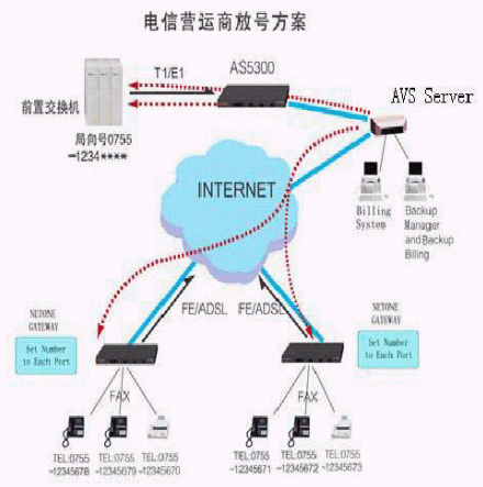 電信運(yùn)營商放號方案采用寬帶數(shù)據(jù)網(wǎng)絡(luò)接入到運(yùn)營商,IP電話數(shù)據(jù)流通過寬帶數(shù)據(jù)網(wǎng)絡(luò)接入運(yùn)營商的局端網(wǎng)關(guān)設(shè)備,或者直接進(jìn)入IP電話網(wǎng)絡(luò)。與傳統(tǒng)的電話相比,電信運(yùn)營商放號方案不需要太多的額外投資購買硬件設(shè)備;只需在用戶端安裝NETONE語音網(wǎng)關(guān)或IP電話機(jī),話吧、網(wǎng)吧、企業(yè)網(wǎng)用戶、校園網(wǎng)用戶及個人用戶就可以在現(xiàn)有的網(wǎng)絡(luò)基礎(chǔ)上實(shí)現(xiàn)IP電話放號服務(wù)。
