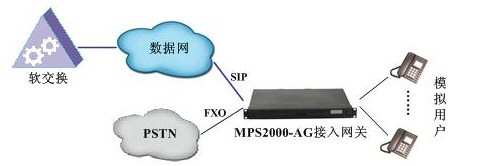 MPS2000-AG接入網(wǎng)關(guān)可提供多種接口,如IP接口、FXS、FXO等,使其具有強大的組網(wǎng)能力。其組網(wǎng)如下所示。