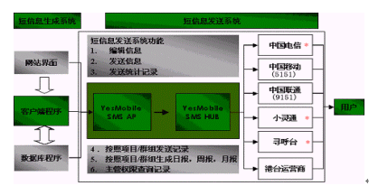 ·由YesMobile提供Api程序包,用戶按照技術規(guī)范開發(fā)Web或客戶端程序完成接入,通過YesMobile的短信平臺向用戶指定客戶發(fā)送信息;
